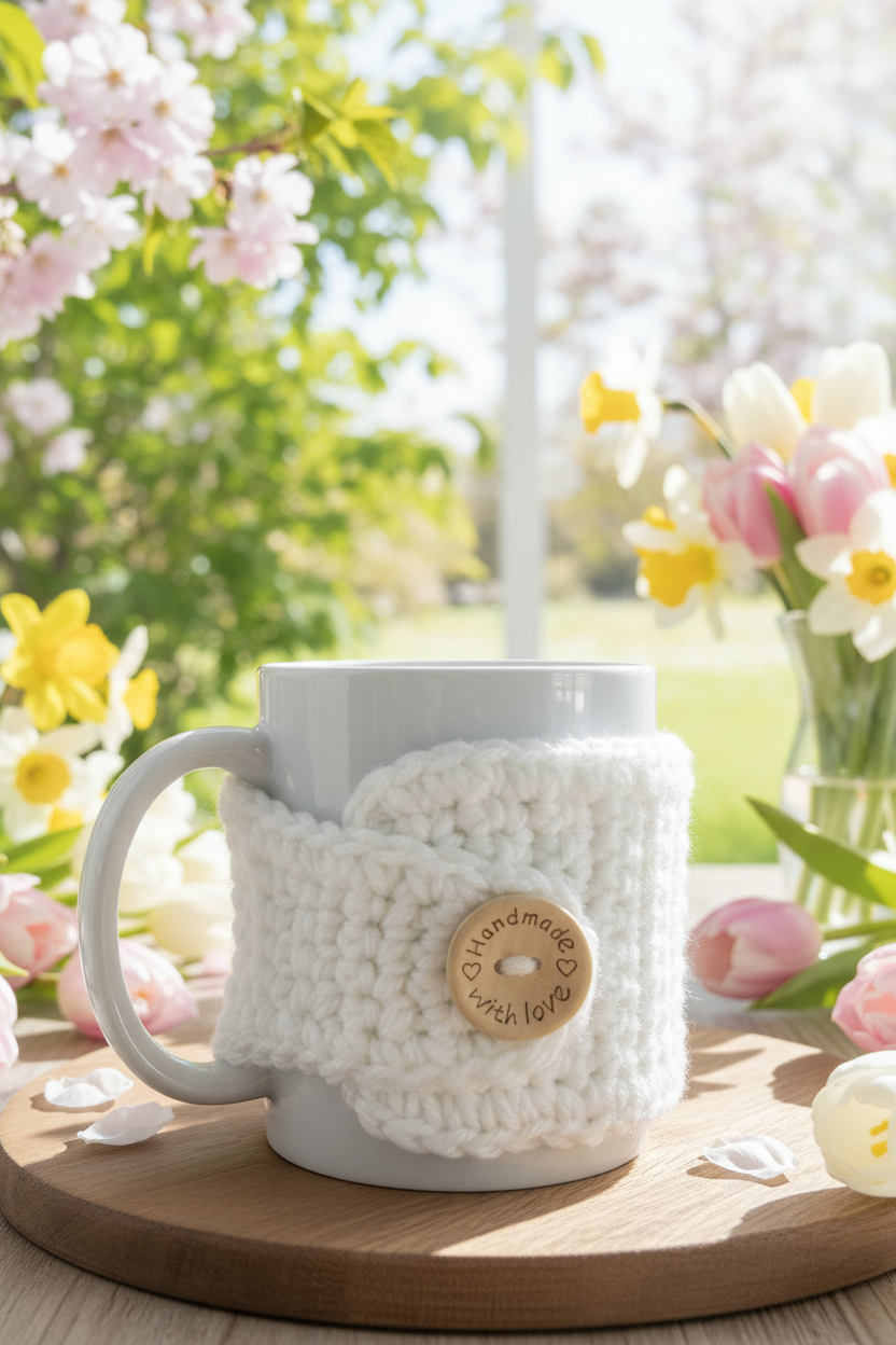 Snuggle up your coffee cup during cozy sweater weather with this handmade white crochet mug cozy. Perfect for 12 oz mugs, it keeps your hands from burning while keeping your drink warm. Plus, the 25mm natural wood button adds a heartfelt touch, saying "handmade with love." It arrives charmingly packaged, perfect for gifting and stuffing into stockings!